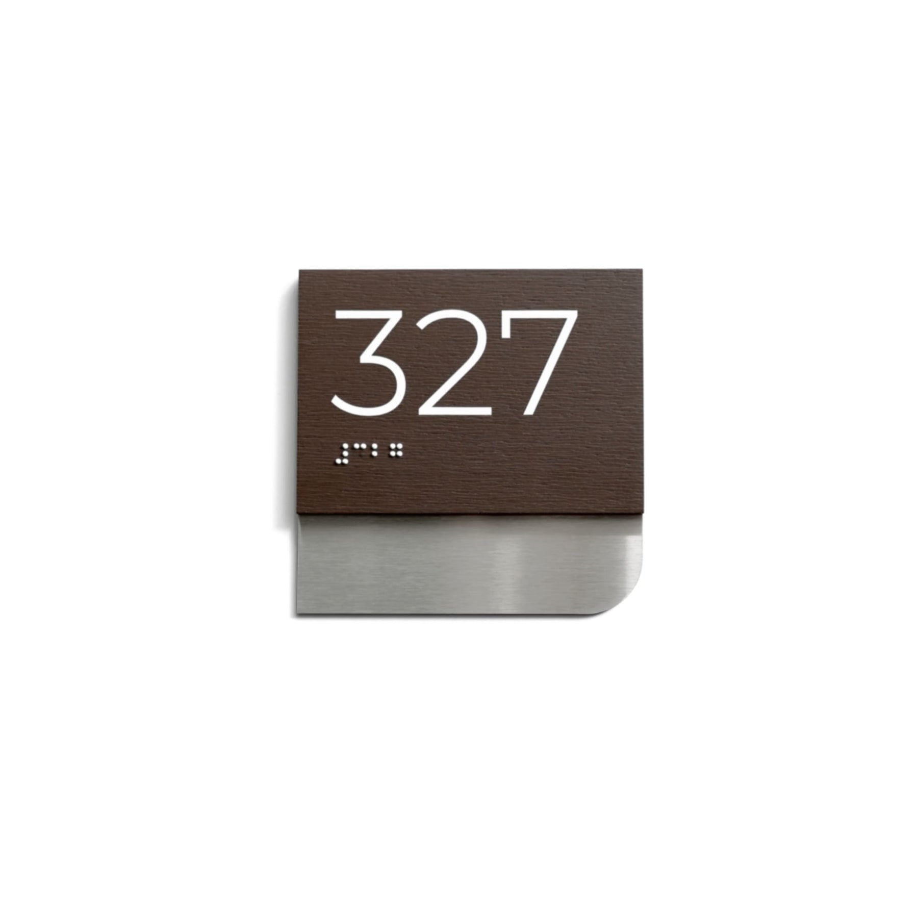 The two-layer construction combines natural wood and stainless steel, creating a strong visual contrast and a refined architectural appearance. UV-printed numbers remain sharp and readable over time, while optional tactile elements and Braille support inclusive environments and ADA-compliant navigation systems.