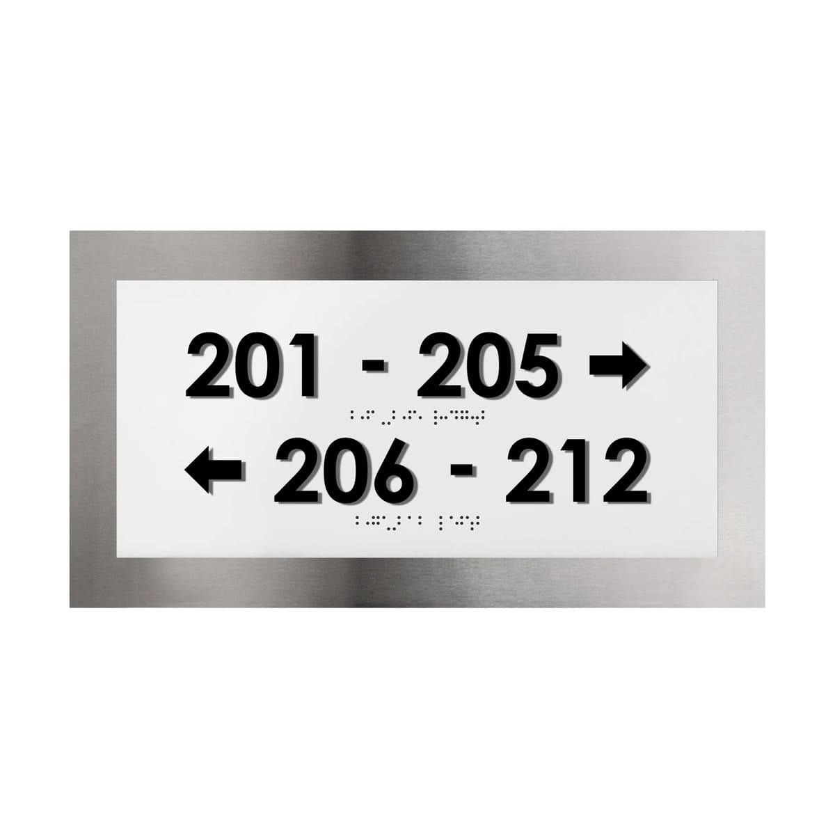 Directional wayfinding plate is made of three layers: one stainless steel next black and milk acrylic.